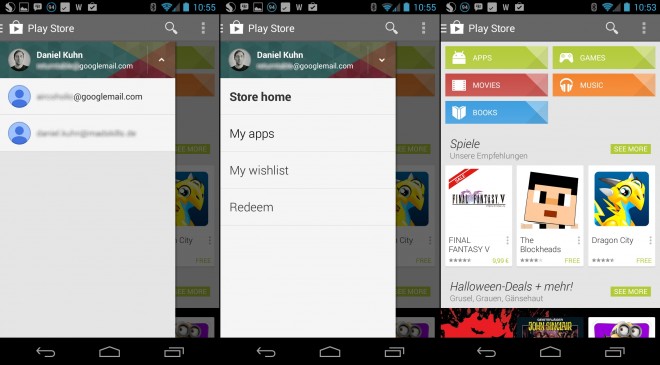 Diese Seitenleiste ist allerdings sehr überzeugend implementiert worden. So ist es nun nicht nur möglich auf einfachste Weise zu den eigenen Apps, der Wunschliste oder der Eingabe von Guthabencodes zu navigieren, auch der Wechsel zwischen Google-Konten wurde deutlich erleichtert.